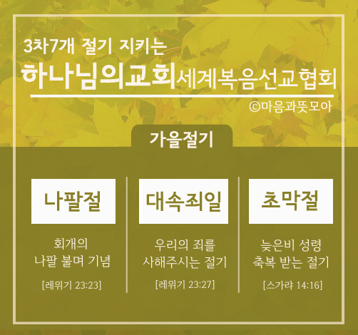 하나님의 절기에는 안식일과 더불어 유월절, 무교절, 초실절, 칠칠절, 나팔절, 대속죄일, 초막절이 있습니다.